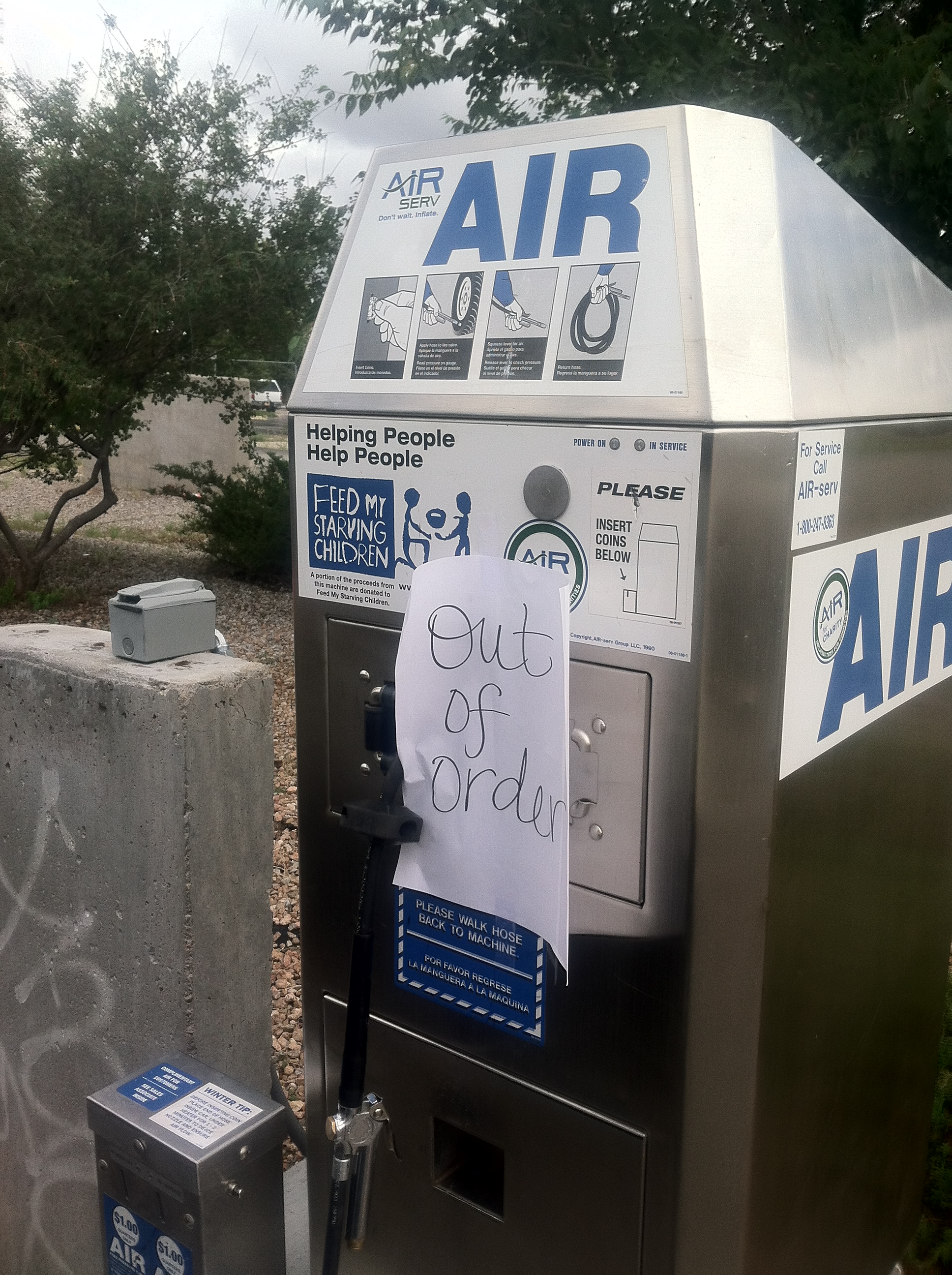 Then someone decided they could monetize that service. Now almost every one makes you pay. In coins. Nothing says “progress” like plugging metal disks into a machine. It works like this: First, find one that works. I am not exaggerating at all when I say I saw 6 air machines today with one of these hand drawn signs taped to it.