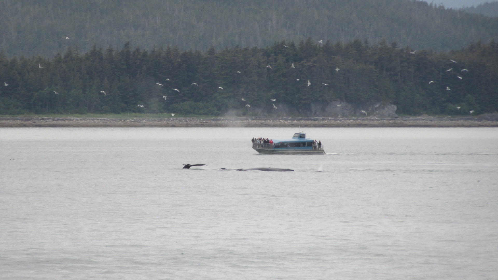 There’s always plenty of wildlife to see. Lots of wading birds, water fowl, terns, gulls, eagles… Every so often you catch a glimpse of an otter or a seal. Whale sightings are virtually guaranteed in the summer. A half hour out of Juneau on one trip, an armada of sightseeing boats drew my attention and soon the water’s surface erupted from the exhale of one of Earth’s largest animals. With the boat and the people in the background, you start to get a sense of how huge a whale really is.