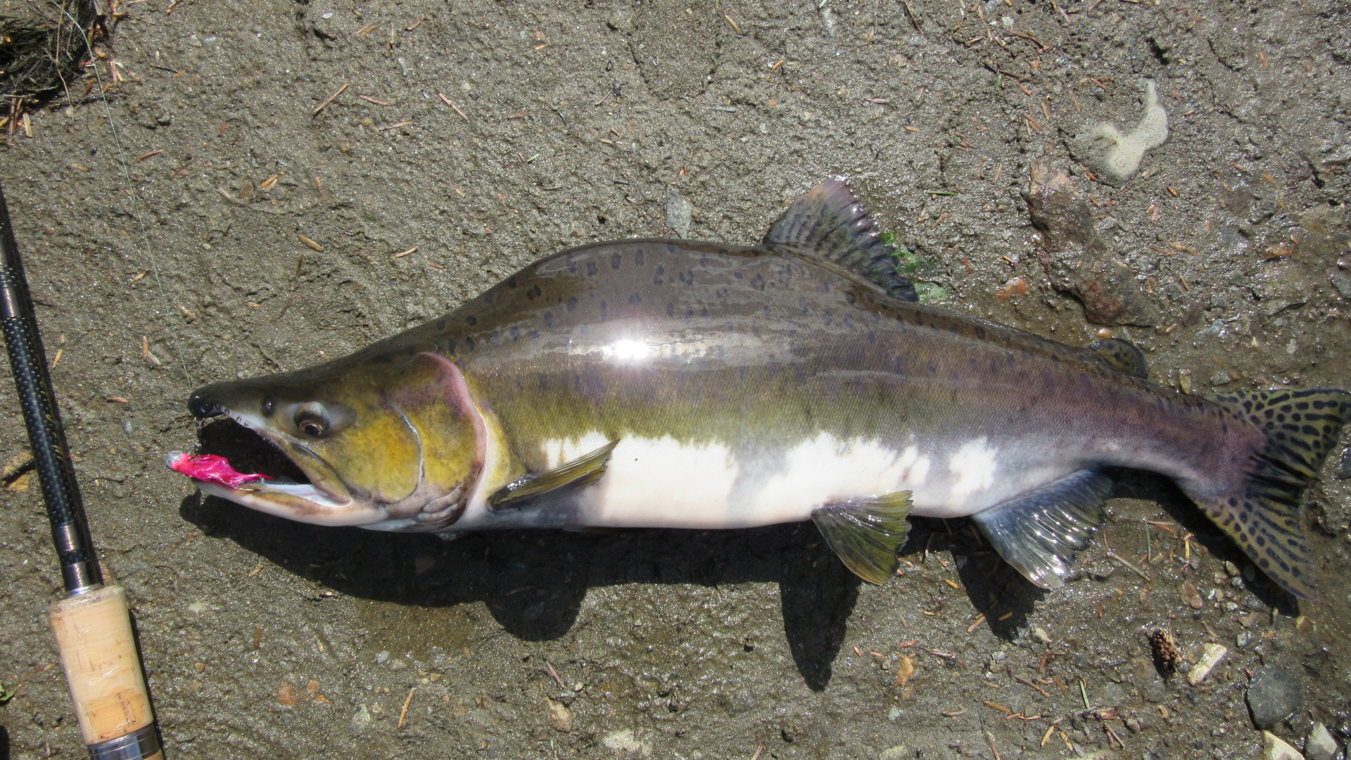 The lake was jammed with Pink Salmon. After a bit of trial and error with different lures, I found one they liked and had a great time wrestling a few of them to the shore. Pink Salmon are also called “Humpback Salmon” and it’s easy to see why.