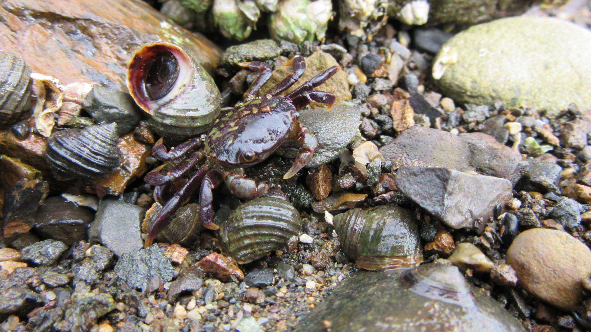 Low tide is a wonderful time to observe a plethora of interesting creatures. This image of a small crab also has a bunch of snails and a limpet.