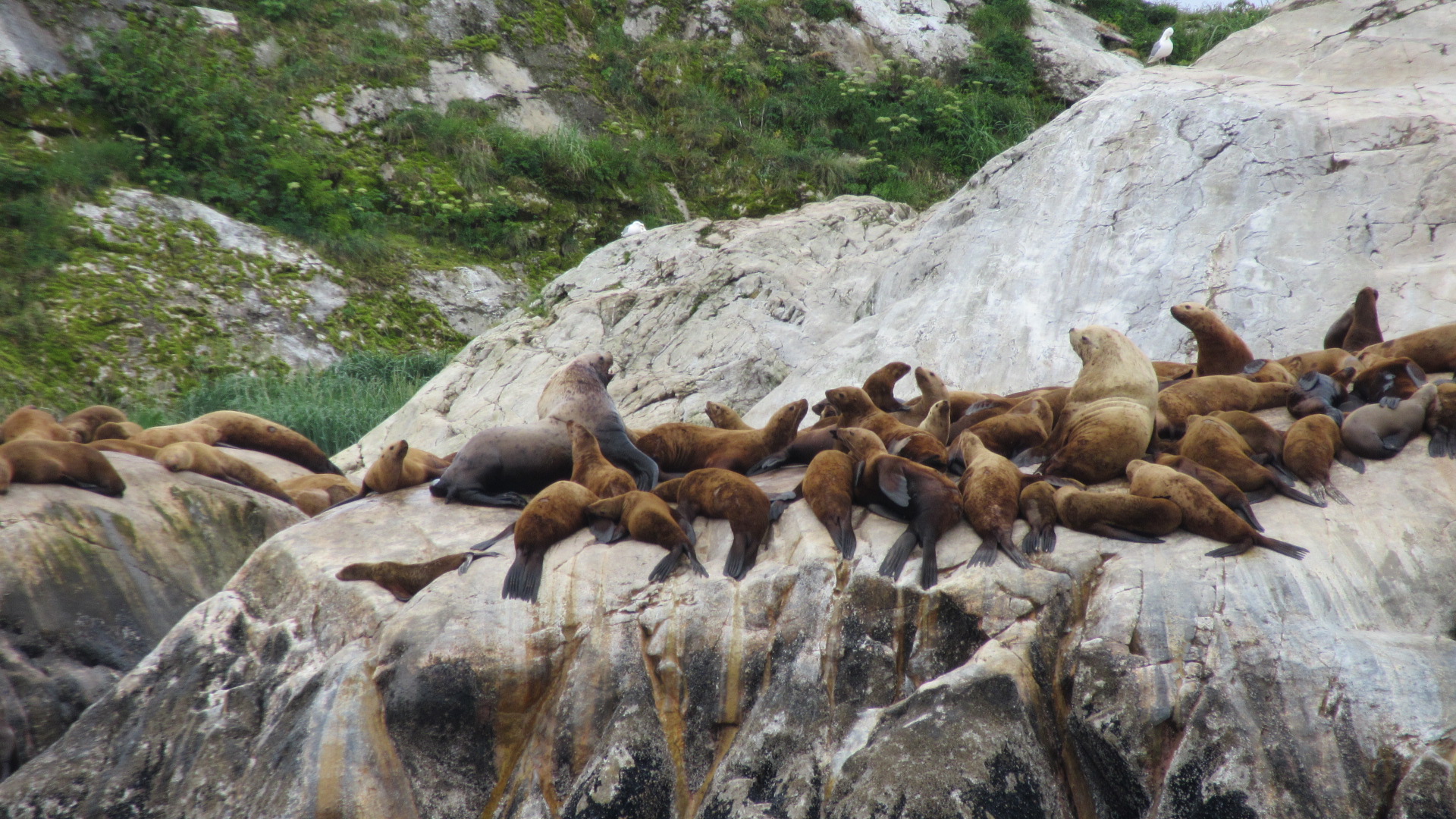 Sea lions jockeyed for position on a marble exposure jutting from the bay.