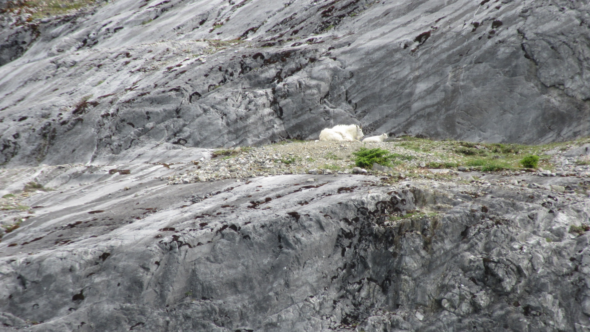 A mountain goat and her kid rest on a patch of grass high above the cold waters.